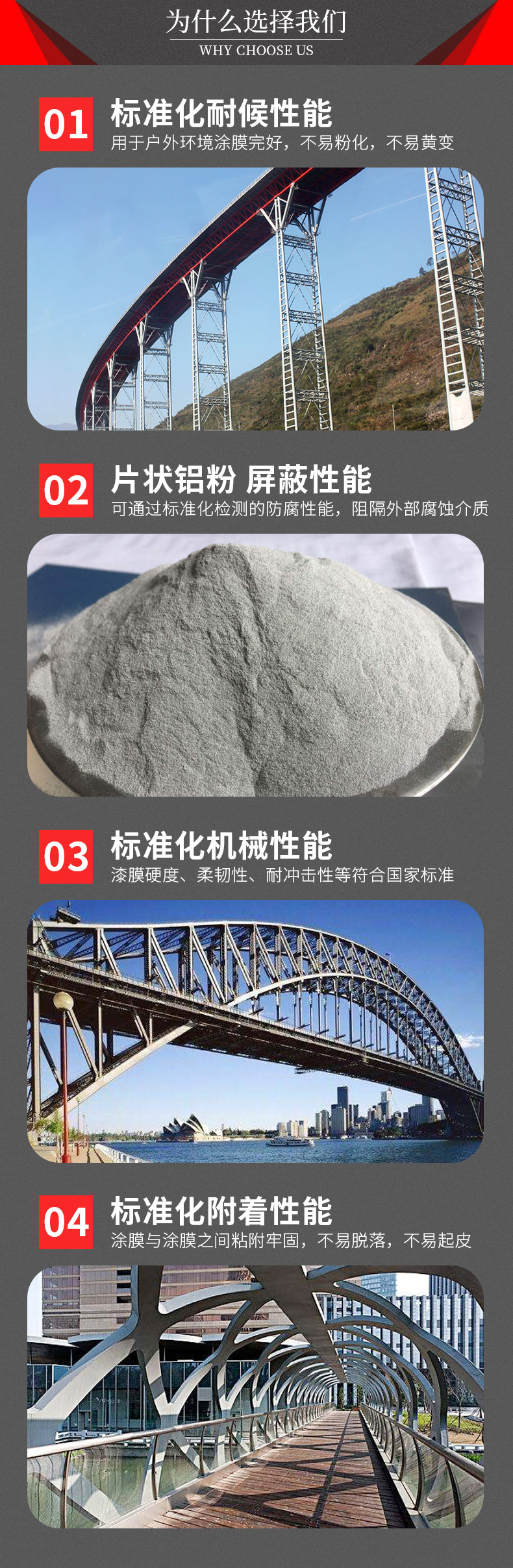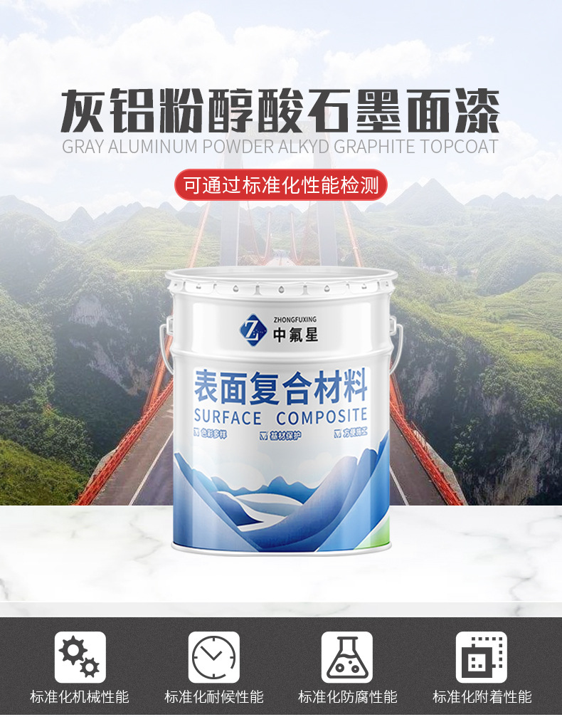 【中氟星】灰鋁粉醇酸石墨面漆由醇酸樹脂、鱗片狀的鋁粉石墨復合顏料、催干劑、多種添加劑、溶劑等配制而成,為單組分。該漆具有可通過標準化檢測的附著力、水氣滲透性、防潮性、耐候性能、抗粉化性、硬度,涂膜豐滿光亮,標準化的耐化學腐蝕性能,具有良好的光澤度和物理機械性能,可在常溫下干燥。