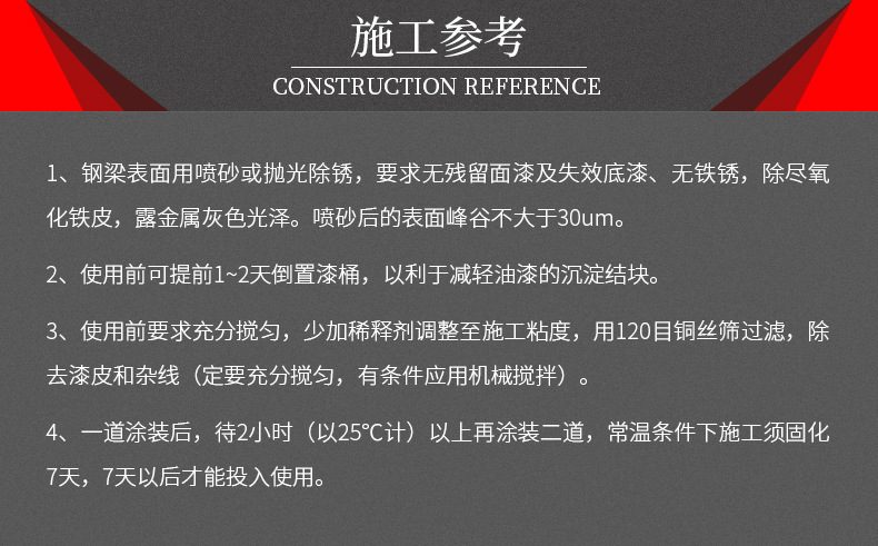 用于各種鐵路公路橋梁鋼結(jié)構(gòu)、鋼橋主體,橋欄桿、扶手、人行道托架、墩臺吊籃、圍欄和橋梁檢查車等橋梁附屬鋼橋,用于氣候干燥、腐蝕環(huán)境較輕的地區(qū),機械設備及一般工程的保護、防腐涂裝。