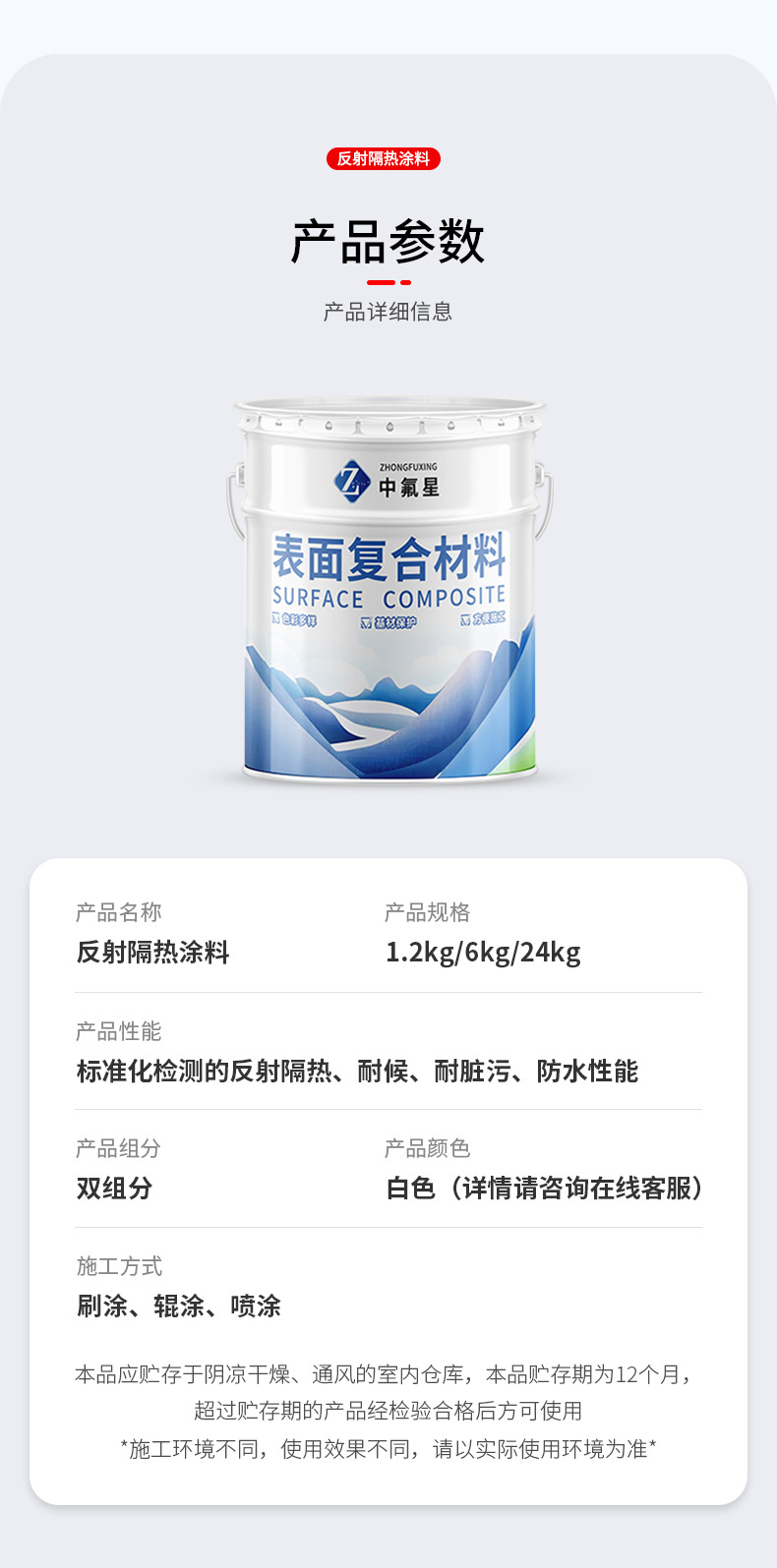 【中氟星】反射隔熱涂料采用反射、隔熱原材料等精制而成,涂料成膜后具有可通過標準化檢測的熱反射隔熱效率、耐候性、耐粘污性等特點。能有效降低墻體表面溫度,適用于各類建筑節(jié)能工程中,是集反熱、輻射與阻隔功能為一體的新型節(jié)能防水隔熱材料。