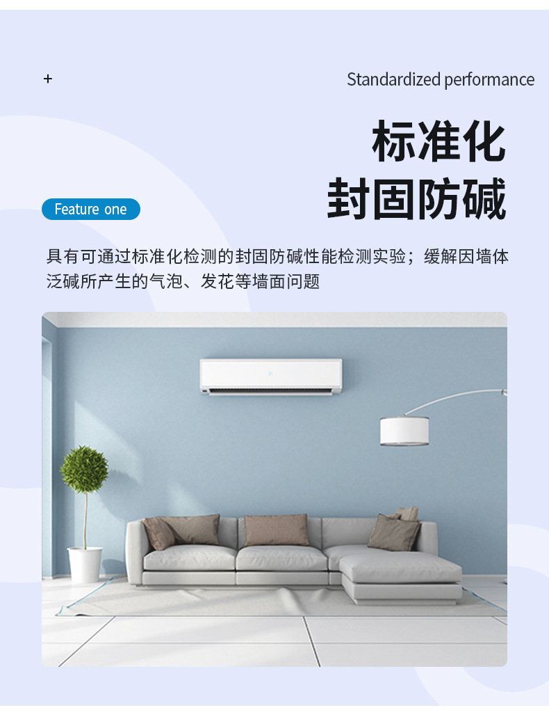 標準化防堿性能:緩解因墻體泛堿所產(chǎn)生的氣泡、發(fā)花等墻面問題;