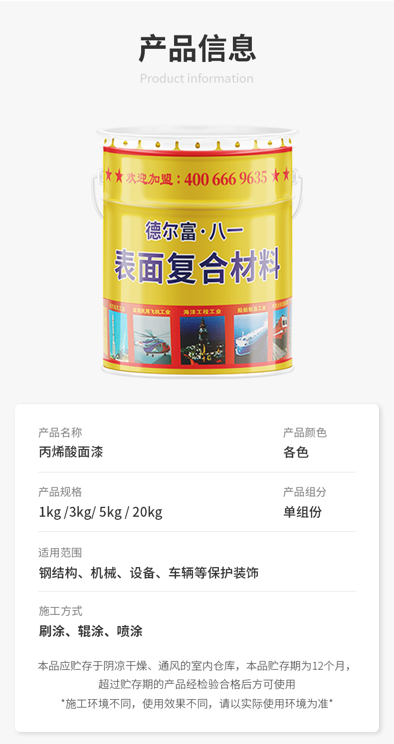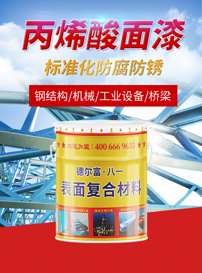 【德爾富】丙烯酸面漆是由熱塑性丙烯酸樹脂、顏料、助劑、溶劑等組成的單組份快干面漆。該漆具有可通過標(biāo)準(zhǔn)化檢測的防腐防銹、耐酸堿腐蝕性、耐久性、耐候性、附著性能、保光保色性、施工性能等性能檢測試驗(yàn)。