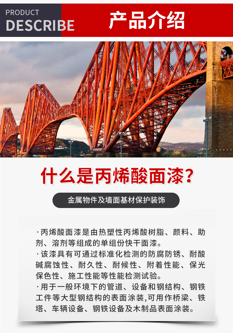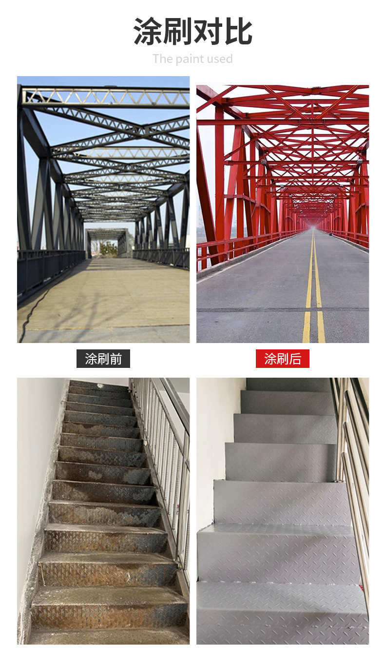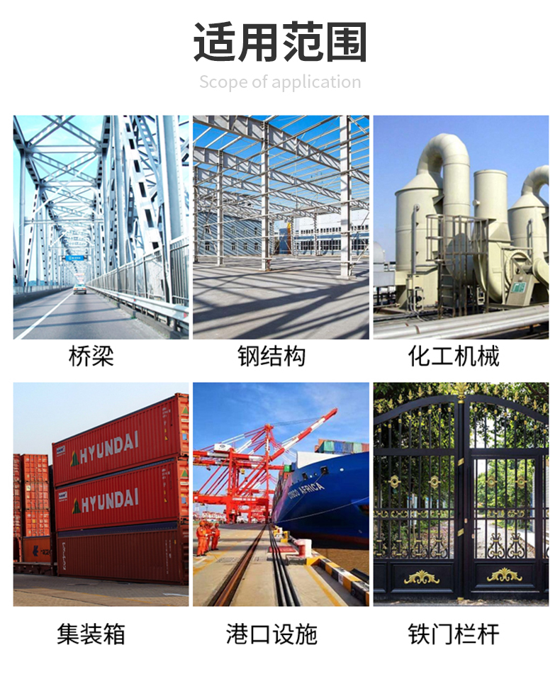 用于一般環(huán)境下的管道、設(shè)備和鋼結(jié)構(gòu)、鋼鐵工件等大型鋼結(jié)構(gòu)的表面涂裝,可用作橋梁、鐵塔、車輛設(shè)備、鋼鐵設(shè)備及木制品表面涂裝。