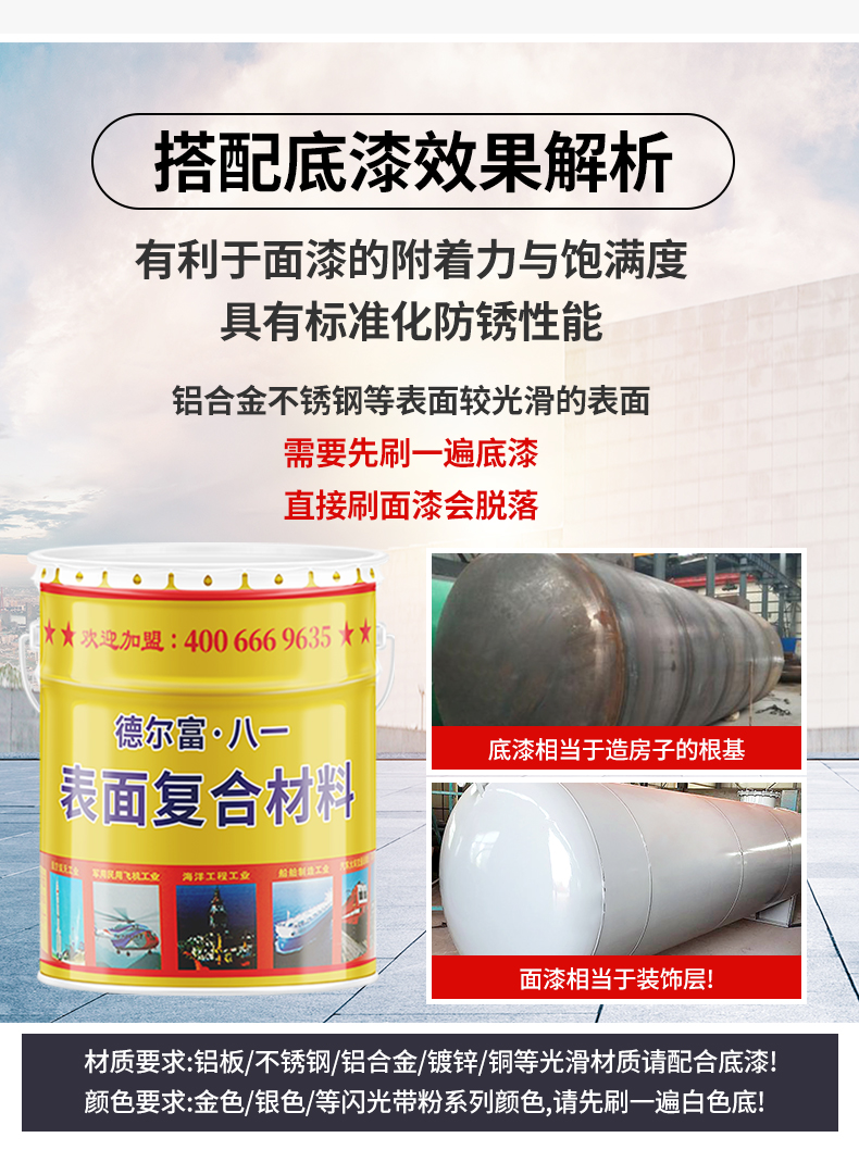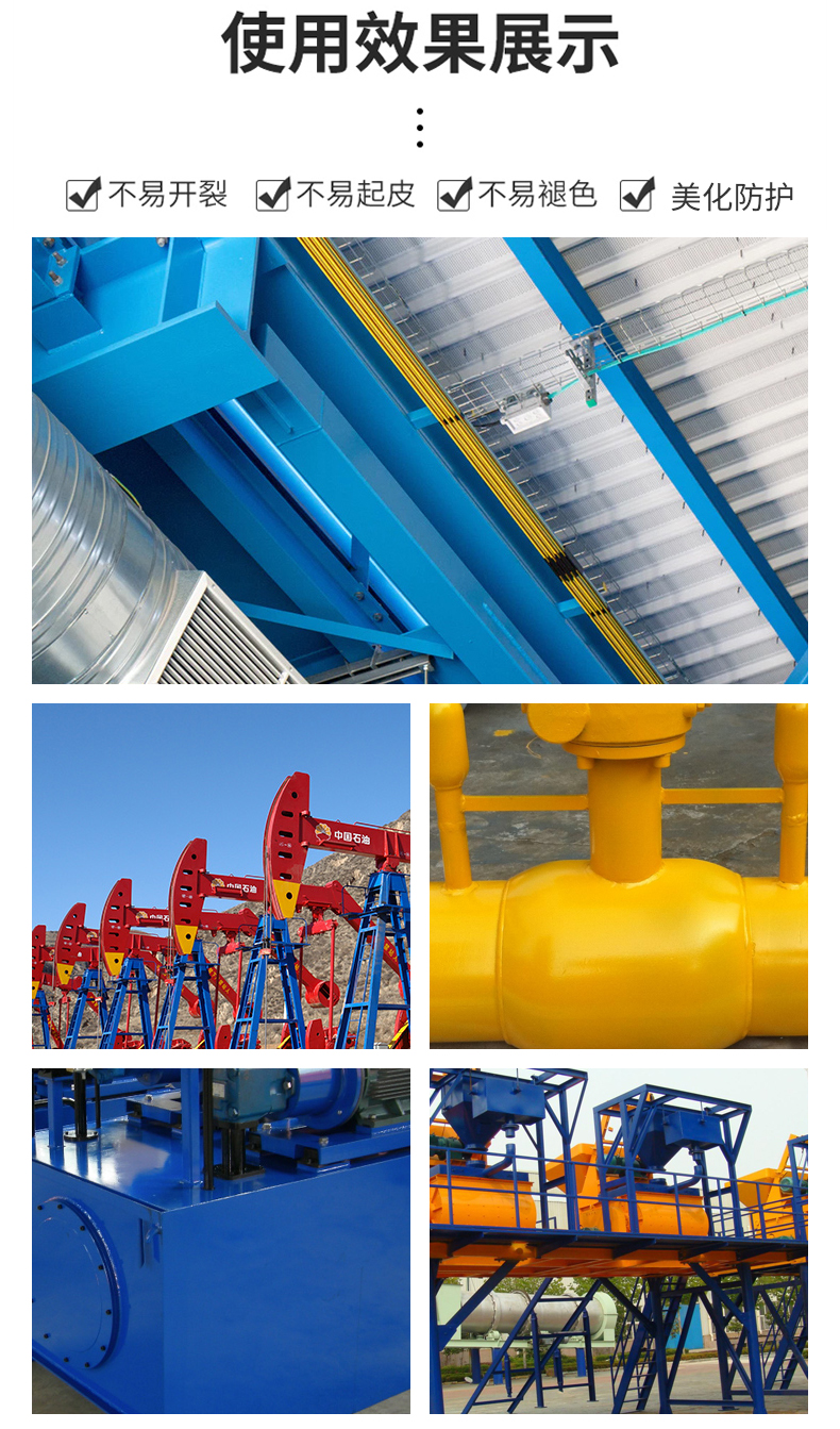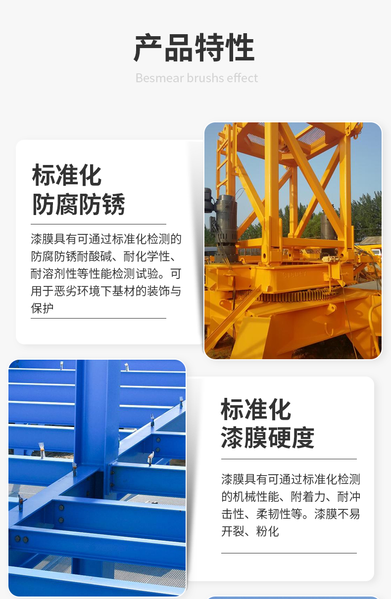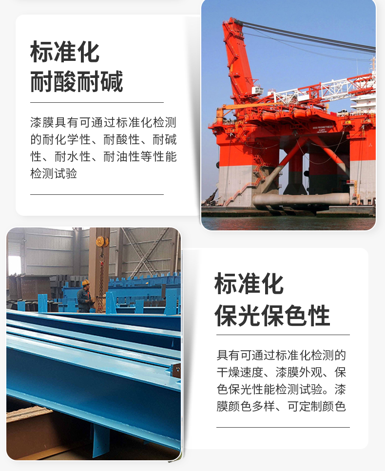 標(biāo)準(zhǔn)化防腐防銹:漆膜具有可通過標(biāo)準(zhǔn)化檢測的防腐防銹耐酸堿、耐化學(xué)性、耐溶劑性等性能檢測試驗(yàn)??捎糜趷毫迎h(huán)境下基材的裝飾與保護(hù)