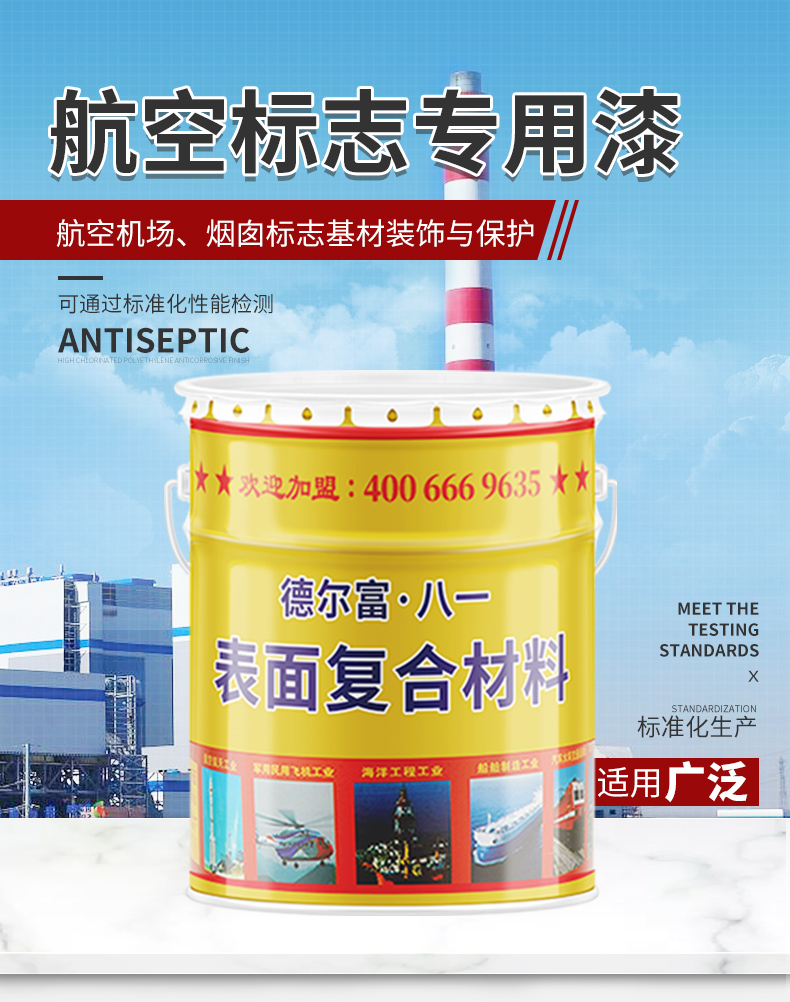 航空標志漆由反光樹脂,反射材料,玻璃微珠,熒光著色顏料、附著力助劑、耐酸耐久高新材料等配制而成。夜晚和黑暗時燈光照射有反射及警示作用。具有保光性和保色性,漆膜堅硬,具有標準耐候性能,長時間不粉化,不泛黃、不脫落。適用于機場、碼頭、煙囪、高層建筑物、鐵塔等公共場所的標志用途。
