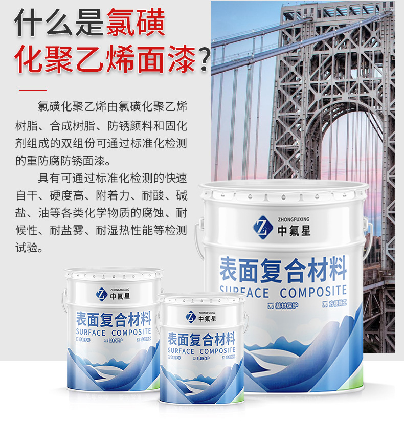 【中氟星】氯磺化聚乙烯面漆由氯磺化聚乙烯橡膠、改性樹(shù)脂、顏料、助劑及溶劑等組成。
