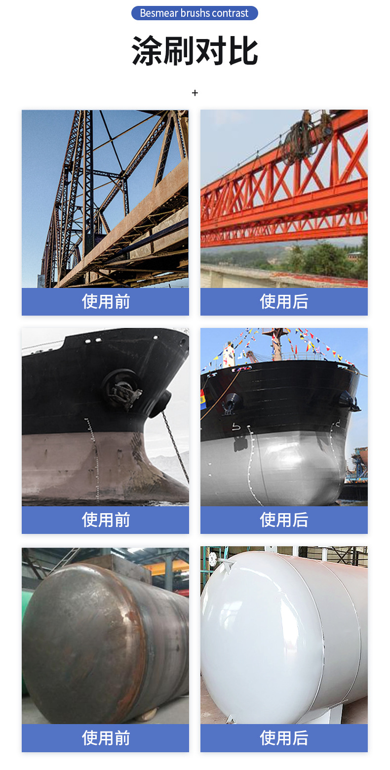 廣泛用于室內(nèi)外各種輕重金屬和水泥結(jié)構(gòu)的表面,起到防銹、防腐蝕的保護(hù)作用,可涂覆于不同環(huán)境下使用的鐵路橋梁、高壓輸電塔、集裝箱、海上鉆探及采油設(shè)備等