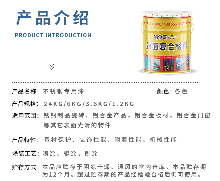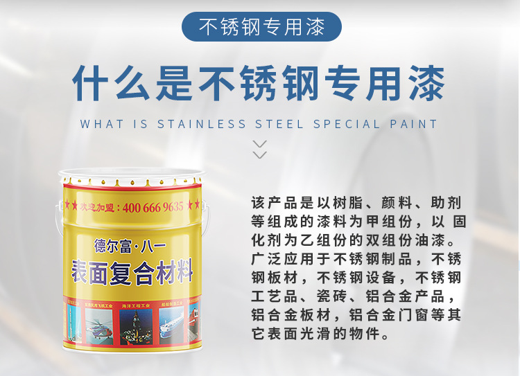 【德爾富】不銹鋼專用漆是我們針對(duì)光滑金屬表面不易涂裝上漆而研制的,具有可通過標(biāo)準(zhǔn)化檢測(cè)的物理機(jī)械性能和防腐性能。不銹鋼、鋁合金、鍍鋅板、鋁板、銅、合金、有色金屬等基材,由于其表面非常光滑,導(dǎo)致涂漆后出現(xiàn)掉漆脫落的問題,使用不銹鋼專用漆可解決這一問題。