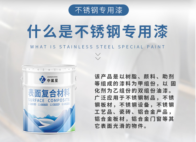 【中氟星】不銹鋼專用漆是我們針對光滑金屬表面不易涂裝上漆而研制的,具有可通過標準化檢測的物理機械性能和防腐性能。不銹鋼、鋁合金、鍍鋅板、鋁板、銅、合金、有色金屬等基材,由于其表面非常光滑,導(dǎo)致涂漆后出現(xiàn)掉漆脫落的問題,使用不銹鋼專用漆可解決這一問題。