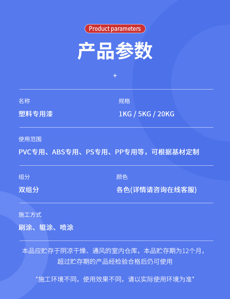 塑料專用漆具有PVC專用、ABS專用、PS專用、PP專用等型號,可根據(jù)所涂基材聯(lián)系客服定制該型號